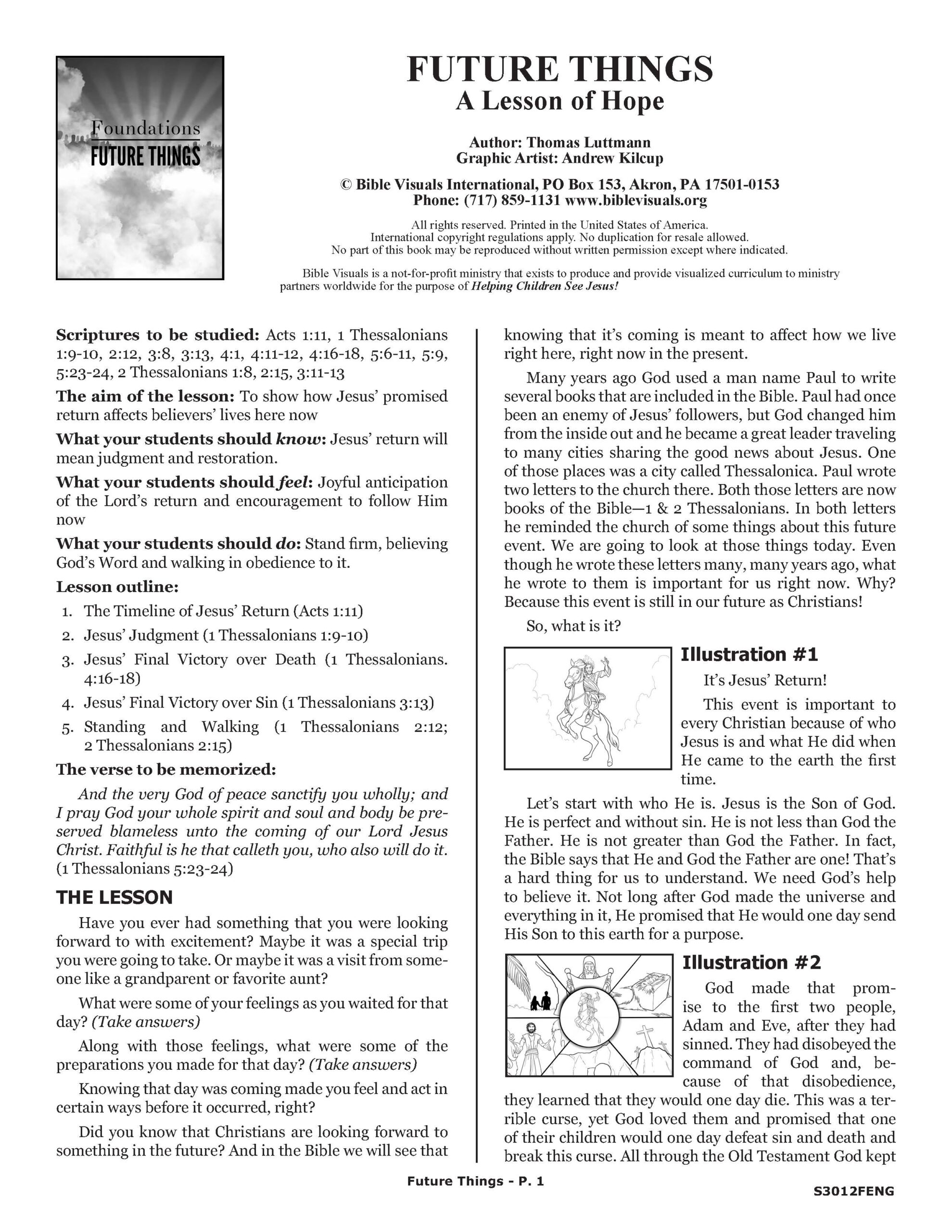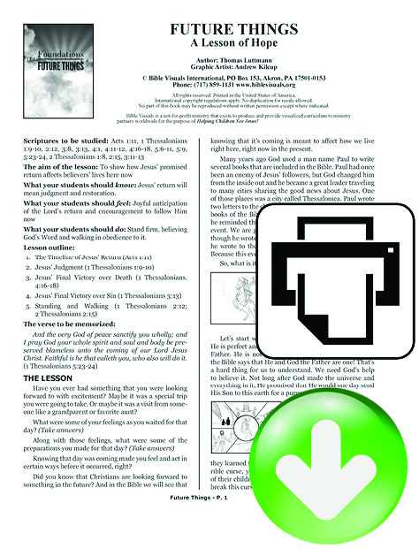 Future Things is a one-chapter Bible Lesson about the second coming of Christ based on Paul’s letters to the Thessalonians. The message of the lesson is that, because Jesus has promised to return, Christians should live their lives in a way that anticipates His coming by standing firm in faith and walking in a manner worthy of God. This lesson is a part of our new FOUNDATIONS series.