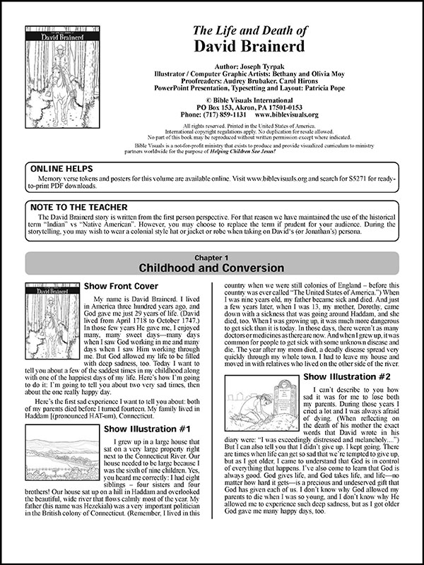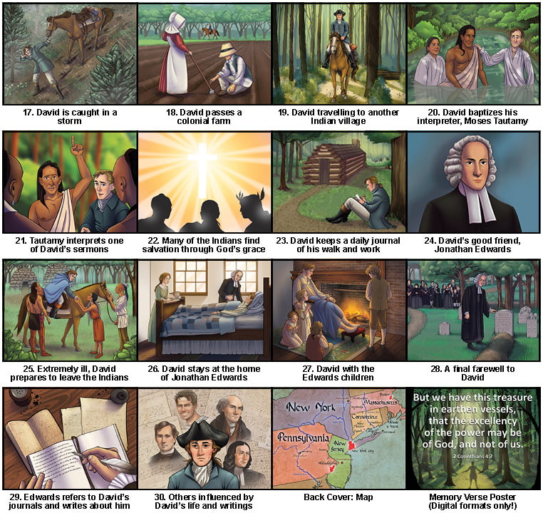 30 full-color illustrations with map and memory verse poster plus five-chapter story text Select product desired and language from drop down menus.