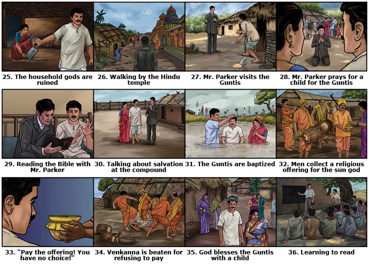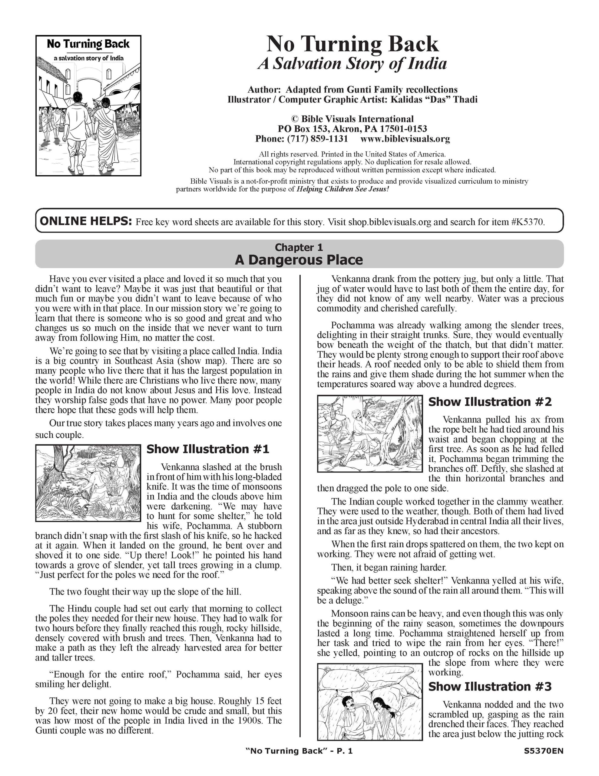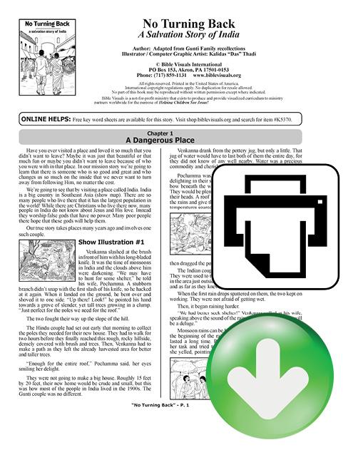 Description: This 5-chapter true story follows a young Hindu couple from the lowest caste in India. When a kind missionary unexpectedly moves into their poverty-stricken village, they hear about the hope found in Jesus, the only true God who has power over death itself. Soon, the Guntis must decide if they will face the pressure to continue worshiping the silent Hindu gods, or boldly commit to following Christ alone — No Turning Back.