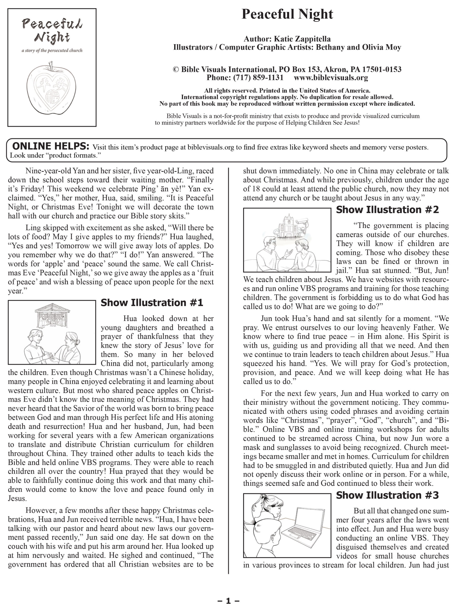 Jun and Hua, a young Christian couple in Asia, are finding creative ways to bring the good news of Jesus to children. In the face of increasing government persecution and the Covid-19 crisis, their family experiences first-hand how God miraculously protects and provides for His people. Peaceful Night explores different Christmas traditions and themes while illuminating the plight of the modern persecuted church.